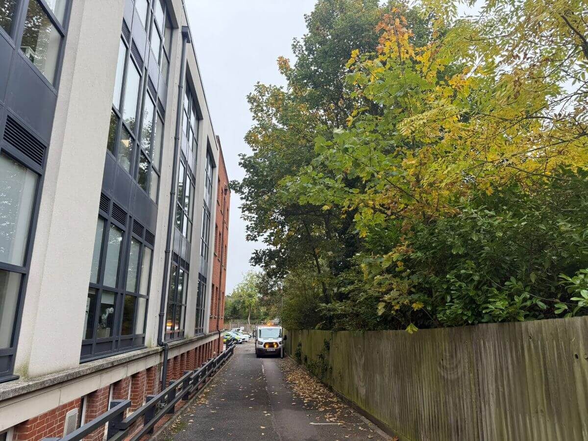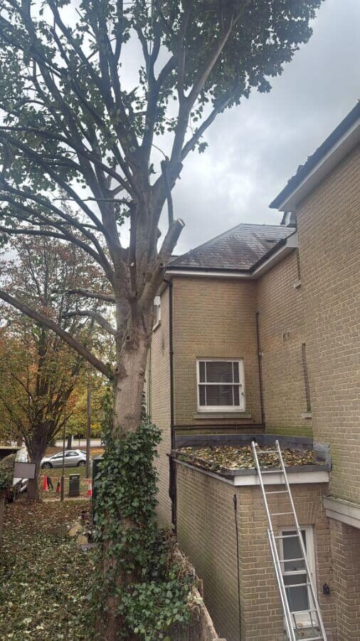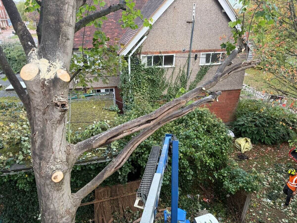 Due to the position of several trees close to buildings and rooflines, we utilised a cherry picker throughout the project. This allowed us to work efficiently at height, minimise disruption to staff and visitors, and maintain a safe working environment on this busy public site.